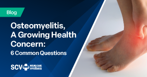 When an infection (typically Staphylococcus aureus) reaches the bone, a lack of blood flow to the area deprives it of bacteria-fighting oxygen and the infection escalates, putting the patient at risk of bone death. Common symptoms of osteomyelitis include swelling and redness, a burning sensation, skin drainage (yellow pus), fatigue, fever, and pain. Specialized wound care is necessary to treat the condition and prevent the development of chronic or recurring osteomyelitis, which often requires ongoing care.